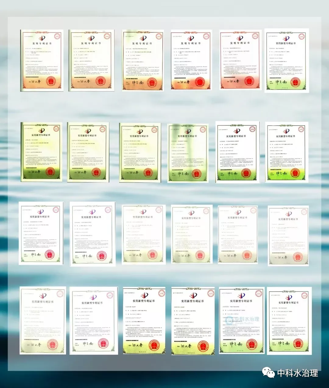 2011年,中科水治理獲得國家“高新技術(shù)企業(yè)”認(rèn)證,完成股份制改造,中科院成為公司第二大股東。上圖為公司獲得過的多項專利證書。