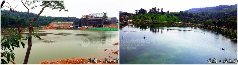 蘭湖屬于原有池塘改造,水域面積16000m2,水深1.2-3m之間,施工后,水體清澈見底,沉水植物生長旺盛,覆蓋率達(dá)到75%以上,各項(xiàng)水質(zhì)指標(biāo)均達(dá)到Ⅲ類水標(biāo)準(zhǔn)。