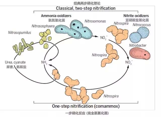 這個理論最先是由俄國微生物界傳奇維諾格拉斯基 (Sergei Winogradsky)早在19世紀(jì)末“成功”展示,他分離出了負(fù)責(zé)這兩步硝化的微生物,也就是所謂的AOB(ammonia oxidizing bacteria)和NOB(nitrite oxidizing bacteria)。但這個超過100年歷史的教條在2015年圣誕節(jié)前被英國明星科學(xué)雜志《自然》上的兩篇同日發(fā)表的題目雷同的文章和隨后一篇在美國微生物學(xué)會的文章終結(jié)了。三個科學(xué)團隊發(fā)現(xiàn)了三種不同的培養(yǎng)[1,2]和一種非培養(yǎng)細(xì)菌[3]能夠各自進行從氨氮到硝態(tài)氮的完全硝化過程。